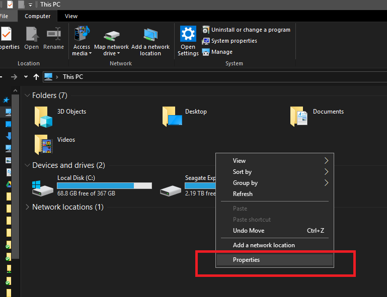 2. 내 컴퓨터로 이동 후, 우클릭 -> 속성(Properties)을 선택 해준다.