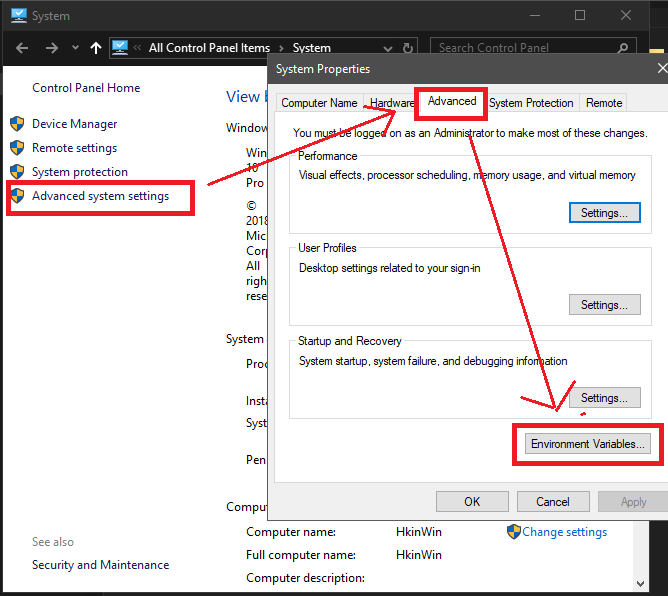 3. 창이 열리면 왼쪽에 부분에서 고급 시스템 설정 (Advanced system settings) 을 선택 -> 고급(advance) 탭을 선택 -> 환경 변수 설정 (Environment Variables...) 선택